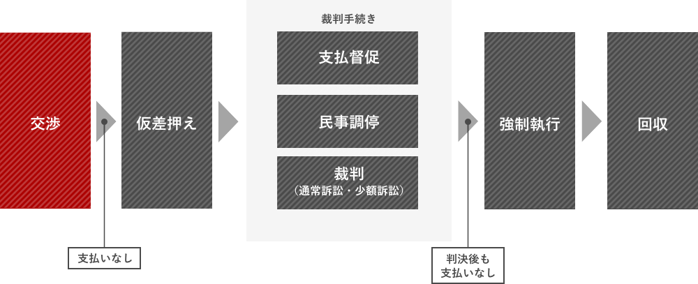 債務者が支払いに応じない場合、法的措置を講じることになります。法的手段としては民事調停、支払督促、少額訴訟、民事訴訟といった手段がありますが、いずれも法律の知識がない個人・法人が自分で行うのは労力と時間がかかります。任意交渉段階から弁護士が入っていれば、スムーズに法的手段に移行することができ、より確実迅速に債権回収を図ることが可能になります。